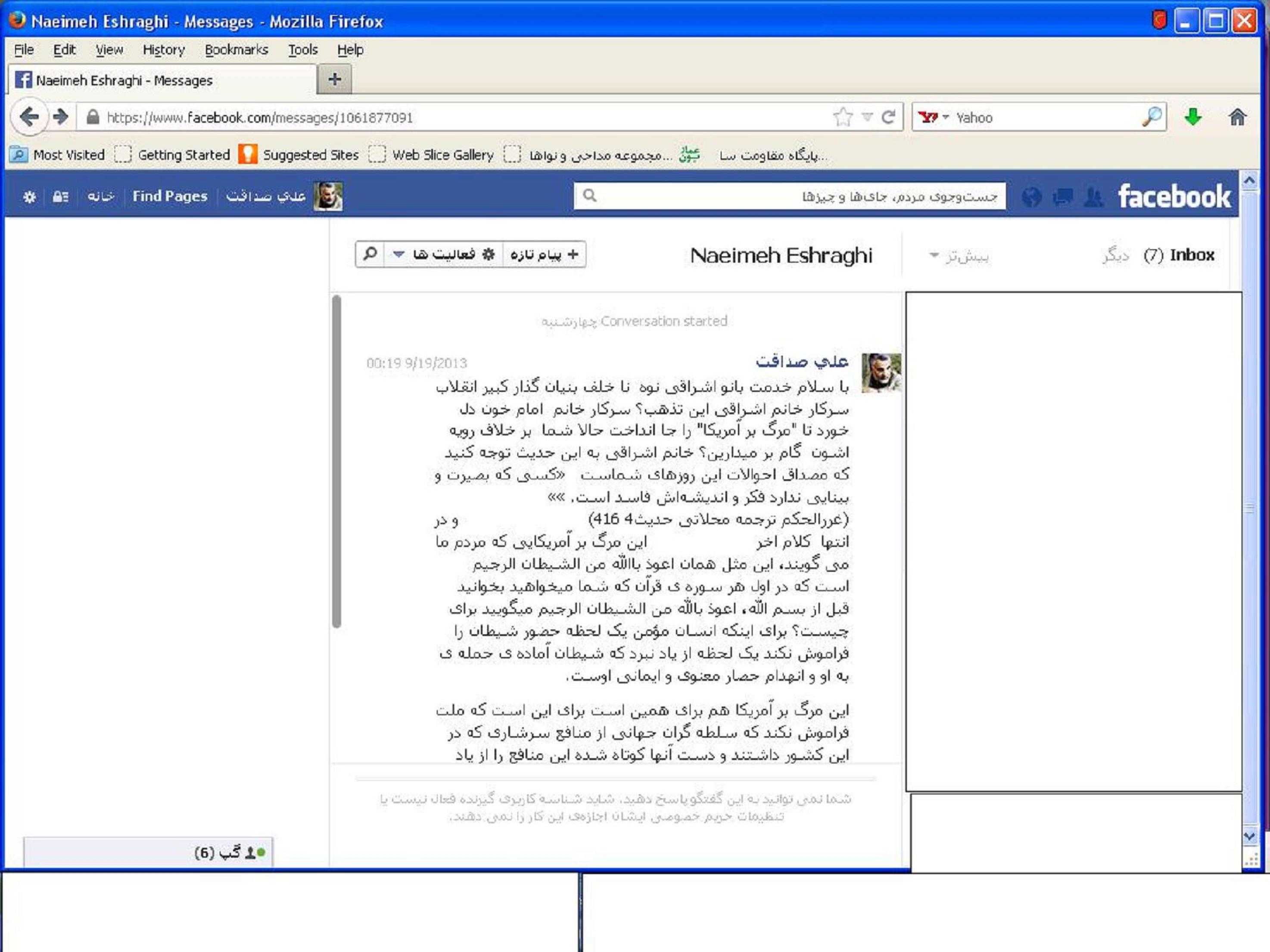 بنده امروز پیامی رو به خانم اشراقی در صفحه فیس بوکشون فرستادم در مورد پست اخرشون