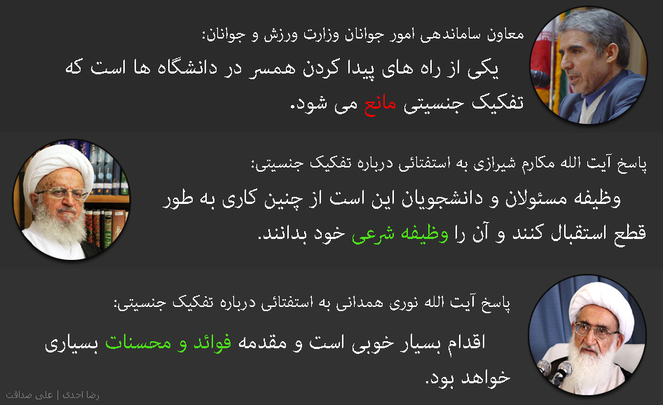 آیت الله مکارم شیرازی به استفتائی درباره تفکیک جنسیتی دختران و پسران دانشجو در دانشگاهها، اردوها و سرویسها اعلام کرد: "وظیفه مسئولان و دانشجویان این است از چنین کاری به طور قطع استقبال کنند و آن را وظیفه شرعی خود بدانند."